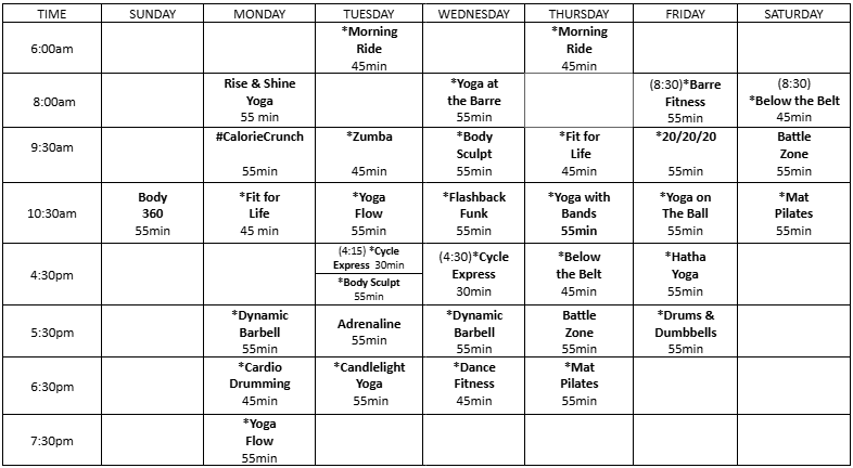 Check out our jam packed group fitness class schedules. We offer barre, zumba, pilates, yoga, cardio, toning, interval training, 50+, relaxation and meditation classes. Something for everyone. Guaranteed.